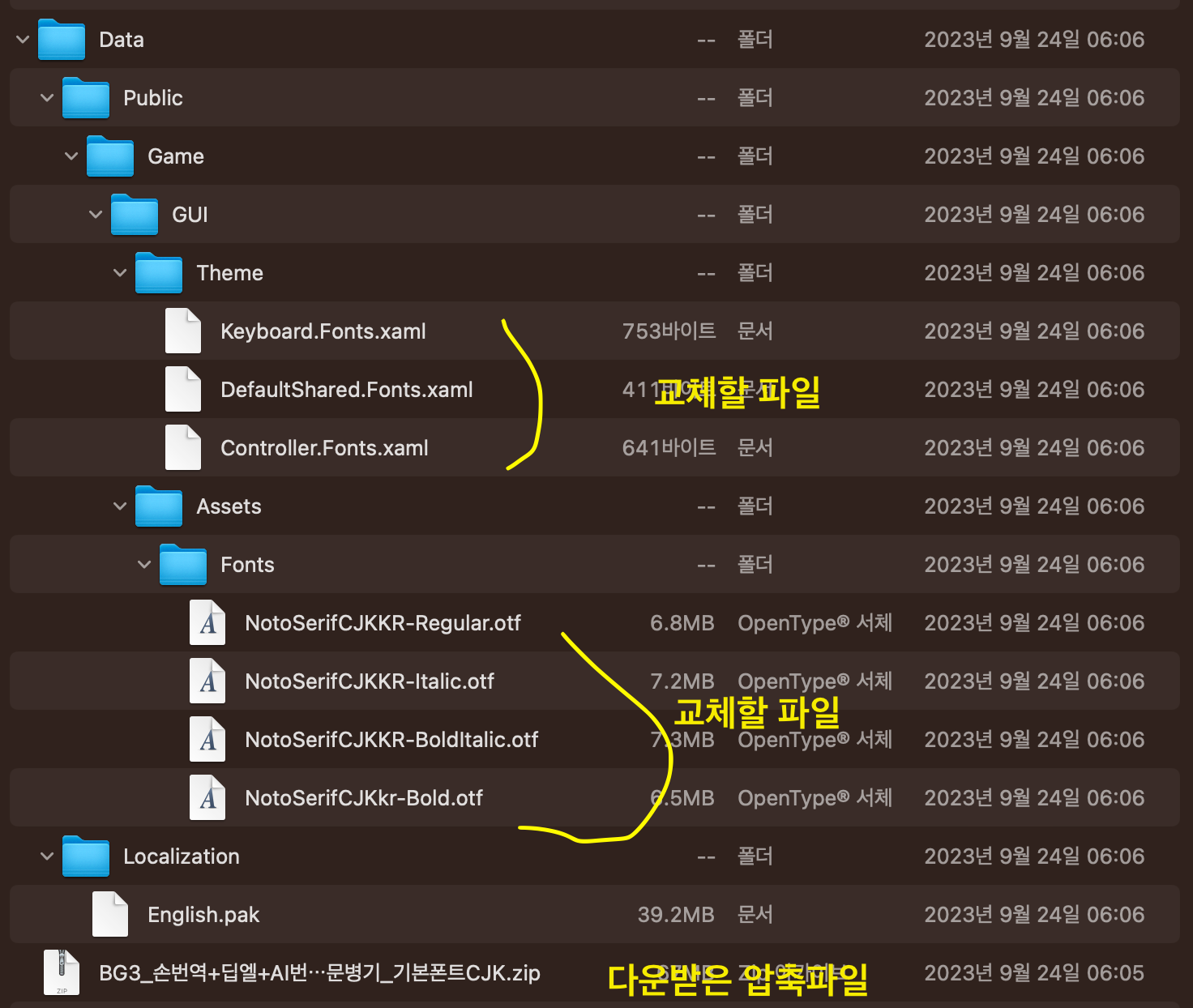 위 사이트에서 패치파일을 받았다면 아래와 같이 "BG3_손번역+딥엘+AI번역_호감도표기_영문병기_기본폰트CJK.zip"파일이 생기고, 압축파일을 풀면 Data폴더 (Public, Localization 하위폴더포함)가 생성됩니다. 실제로 한글채피에 필요한 파일은 아래 8개 파일이며 정해진 폴더위치에 넣어줘야 합니다.