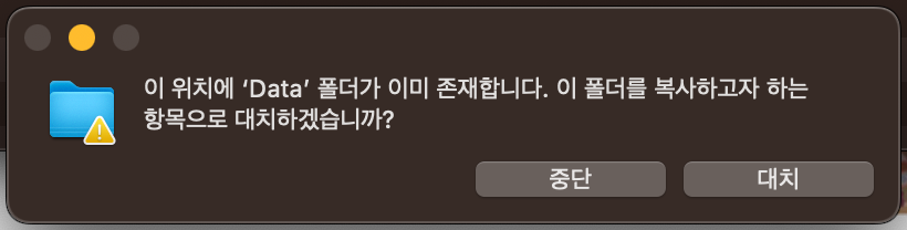 빨리 하고 싶은 마음에 Data폴더를 통으로 복사해버리면, 아래처럼 대치하겠냐는 질문이 나오는데 여기서 '대치'를 누르는 순간 Data의 기존파일들이 모두 날라가 버립니다. 무조건 주의하셔야 합니다!!