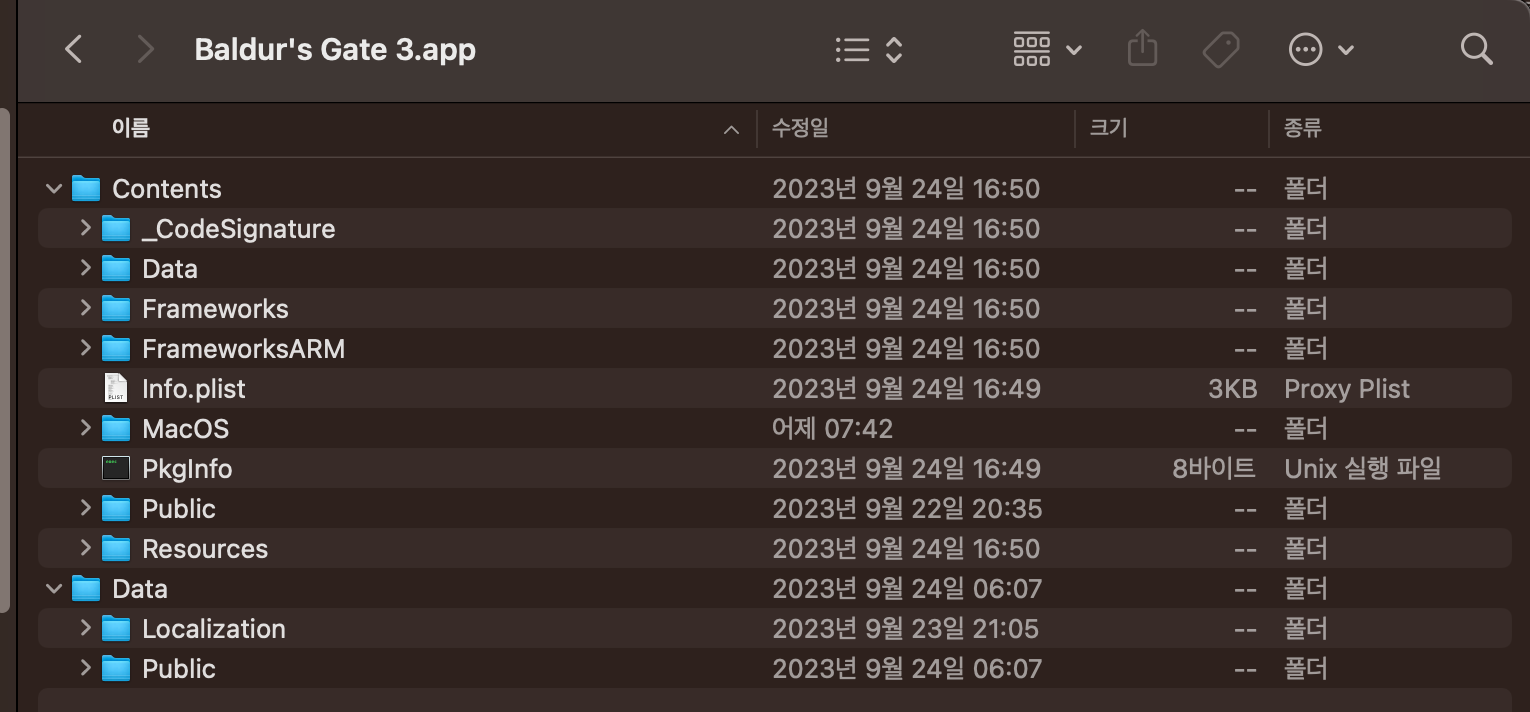 로컬폴더를 찾았으면, 패키지내용보기를 눌러 폴더를 확이해보면 Contents폴더와 Data폴더가 확인됩니다.