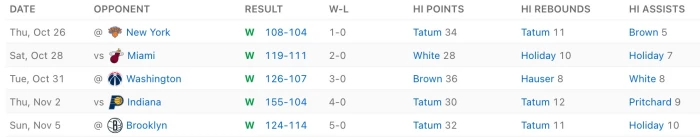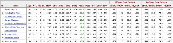 보스턴 셀틱스의 공격력은 현재 리그 1위는 물론, 미친 수준입니다. 각종 공격 수치 FG%, 3P% 등 모두 압도적 1위이고, ORtg (100 포지션당 득점) 또한 125.6으로 1위를 기록하고 있습니다. 사실 공격수치는 인디애나의 게임이 가비지로 155점이나 넣다 보니 부풀려진 느낌이 없진 않지만 어쨌든 5연승에 걸맞은 기록지입니다. (보스턴 기록 보러 가기)