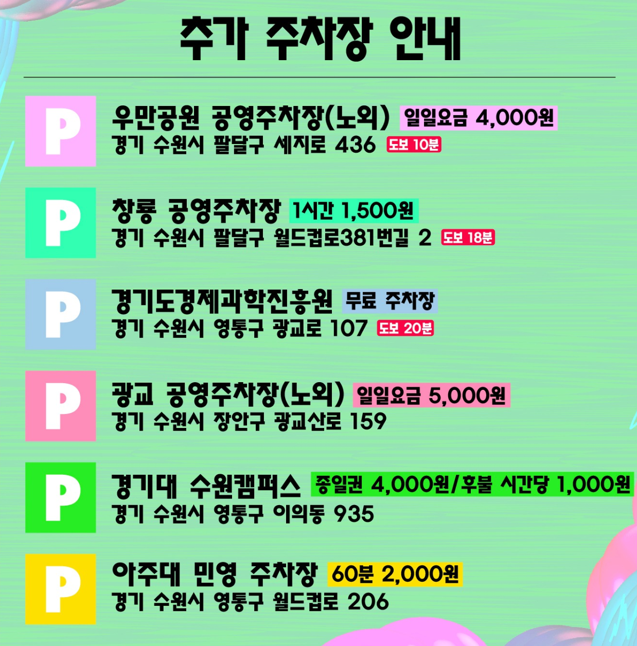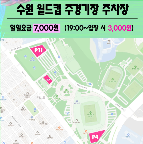 수원 월드컵 경기장을 주변으로 추가 주차장을 안내고 있으나 페스티벌만을 위한 주차장은 아닙니다.