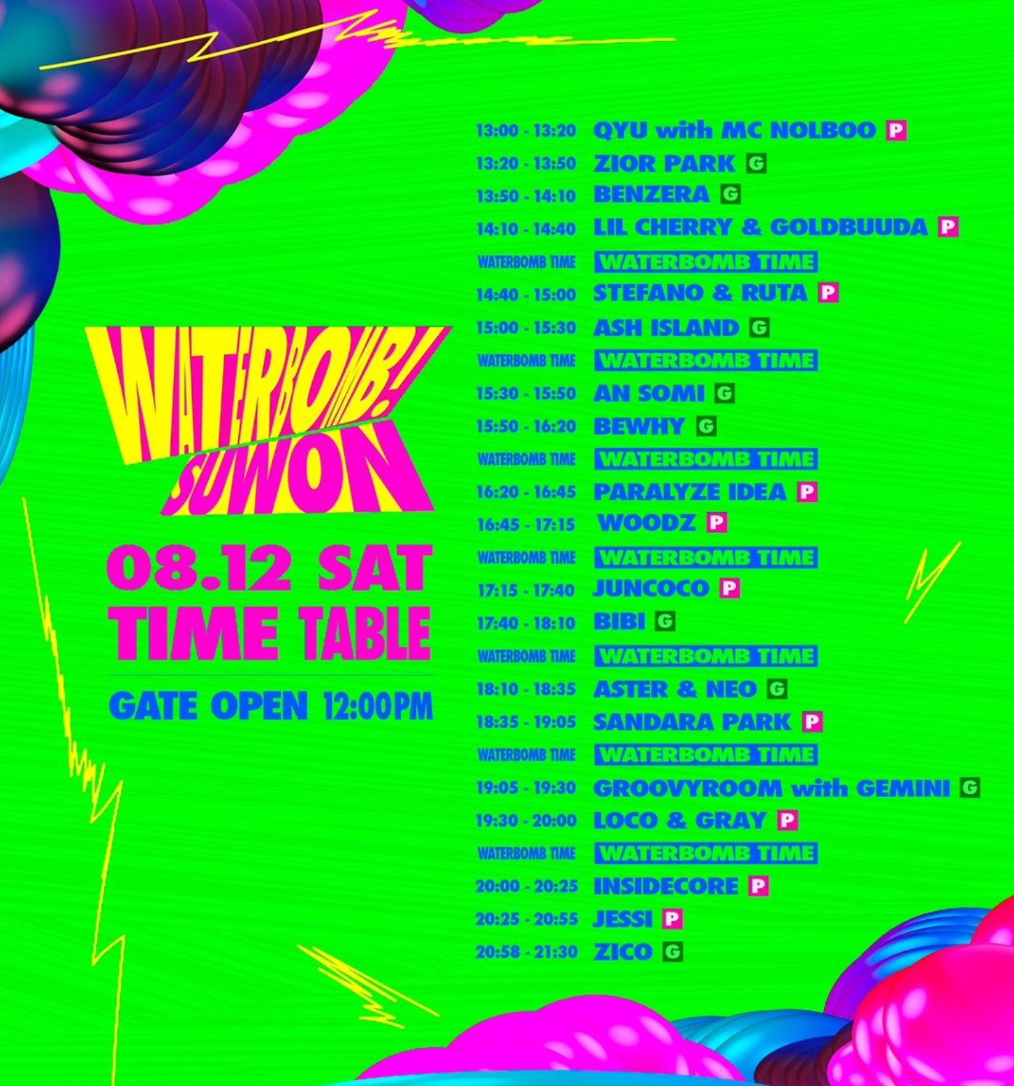 타임테이블은 최근에 공개가 되었습니다. 다른 페스티벌과는 조금 다르게 무대가 30분내외로 짧고, 워터밤 타임을 갖는다는 것이 특징이네요. 13시부터 시작하여 21시 30분에 무대행사가 종료 됩니다.