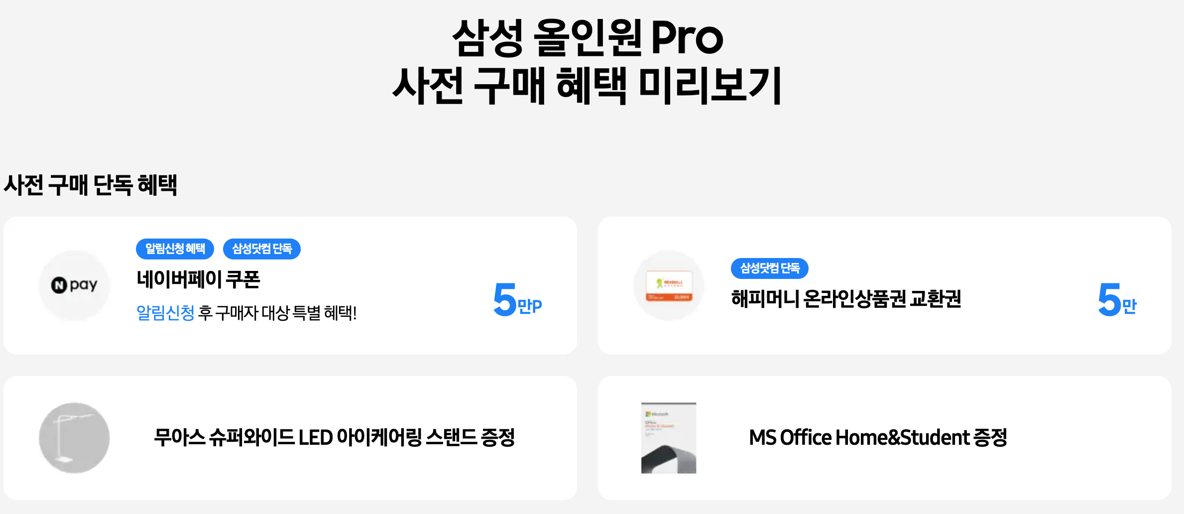 올인원 Pro 정식 판매일은 4월 22일이며, 4월 8일부터 사전판매 신청을 받고 있습니다. 아래 삼성닷컴 링크를 통해서 사전판매 신청 및 혜택을 확인하실 수 있습니다.