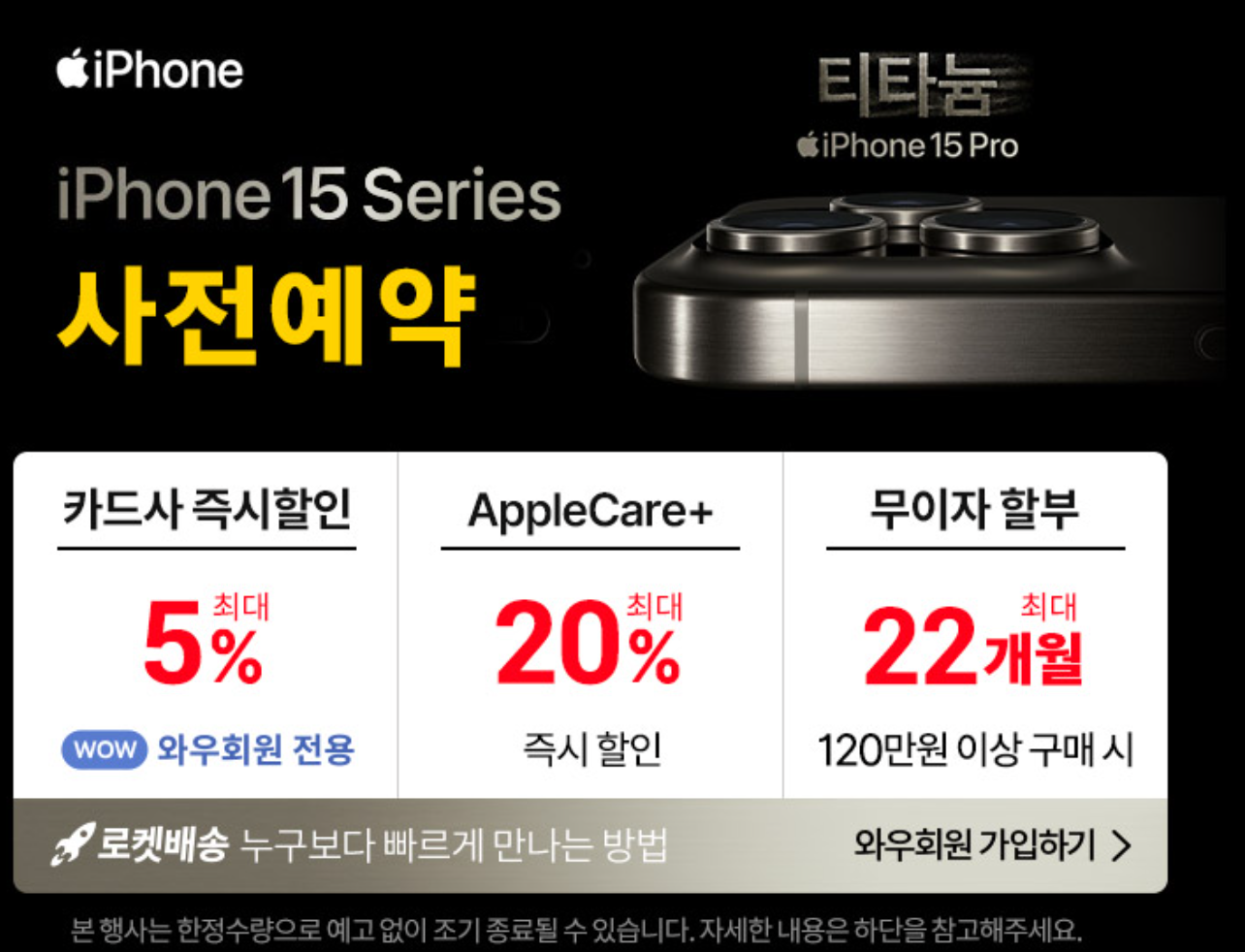 • 사전예약 혜택을 정리해보았는데요. 가장 합리적인 선택은 바로 '쿠팡 사전예약(클릭)'입니다. 5% 즉시할인에, 무이자 할부가 가능하며 로켓배송을 통해 출시일10/13에 바로 아이폰15를 만날수 있을것으로 생각됩니다. 혹시 와우회원이 아니신 분들은, 1달간 무료체험이 가능하기때문에 이번 아이폰 15를 살때만 잠시 무료체험하시고 바로 해지하시면 되겠습니다.