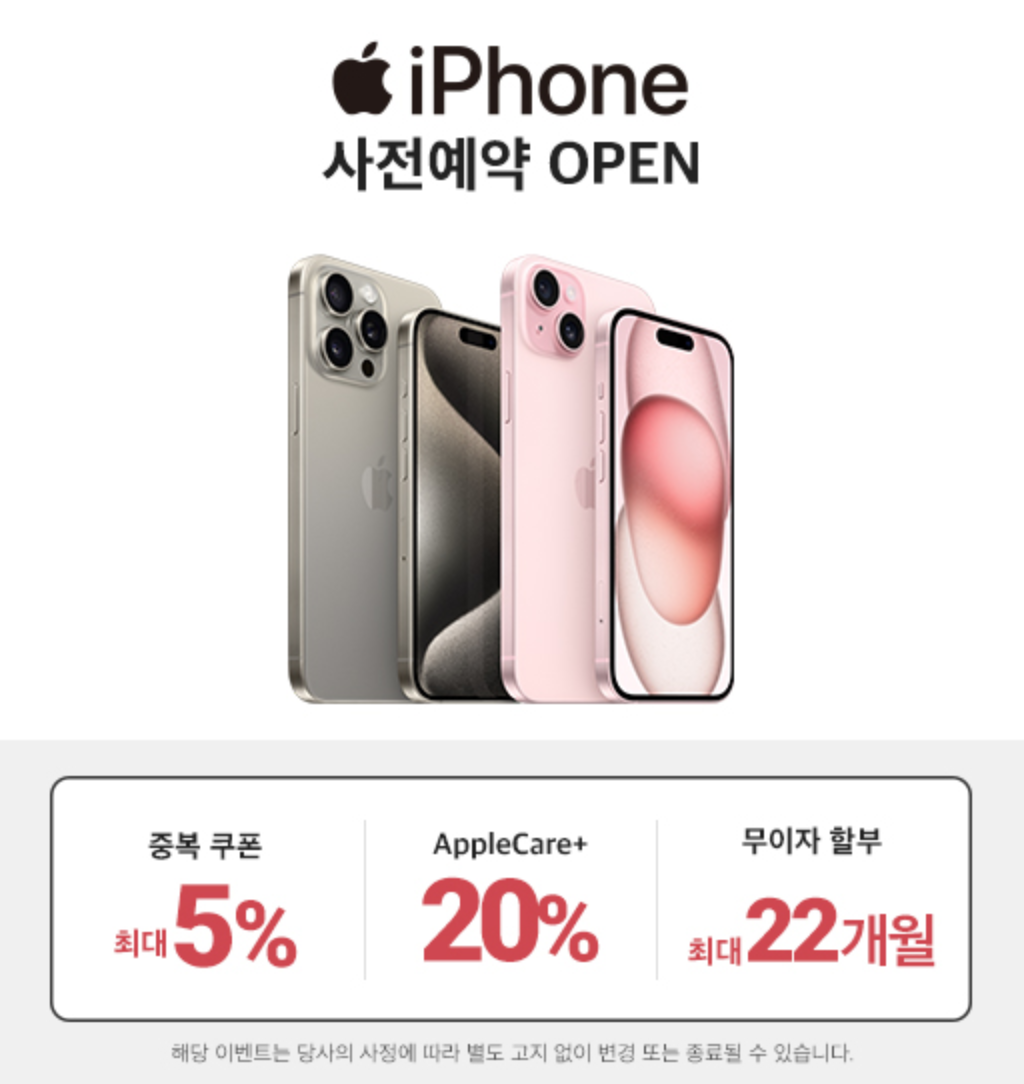 | 11번가 | 5% 할인, 애플케어 20% 할인, 무이자할부 22개월 | 사전예약 바로가기 |