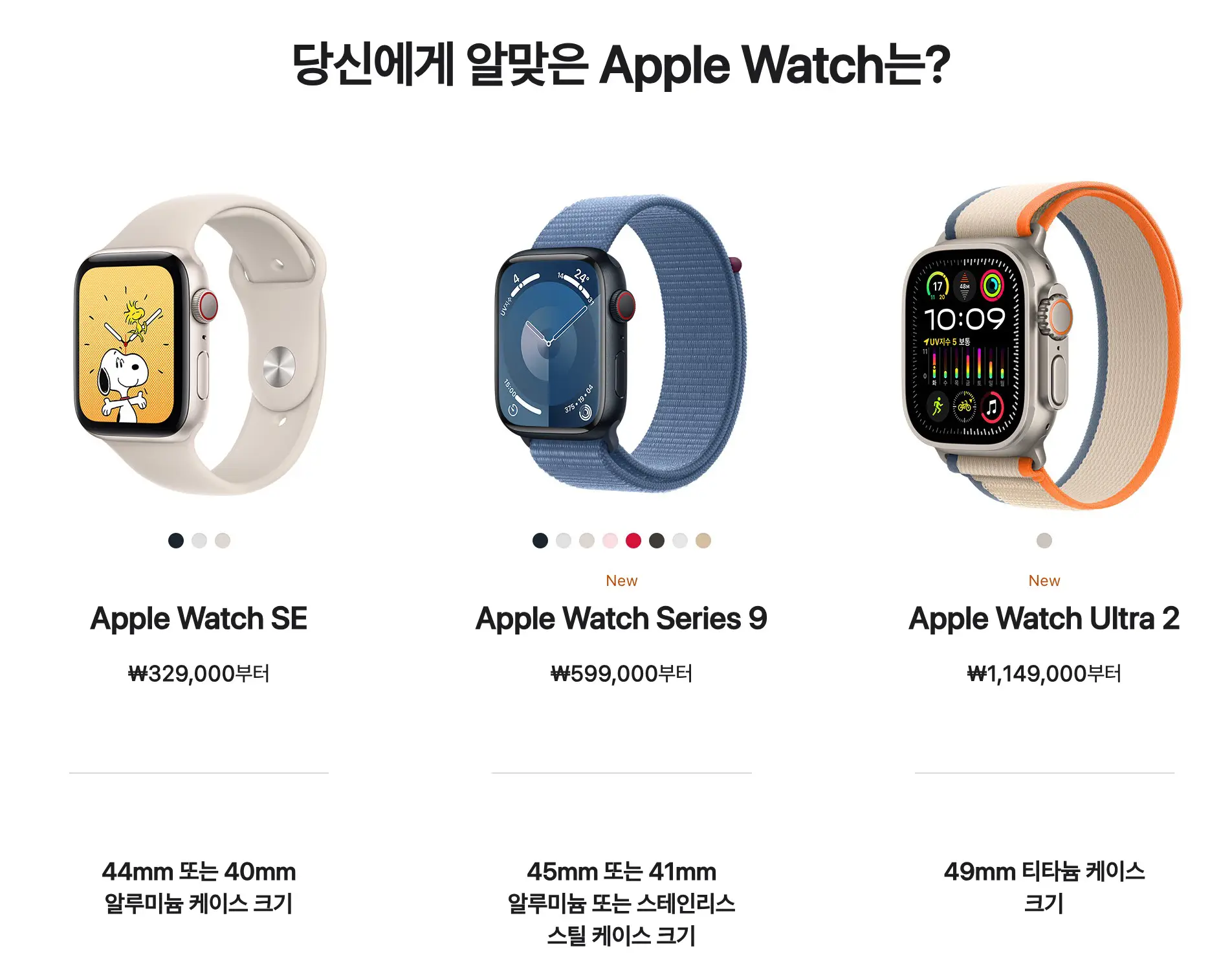 | 모델 | 애플워치 SE2 | 애플워치 Series 9 | 애플워치 울트라2 |