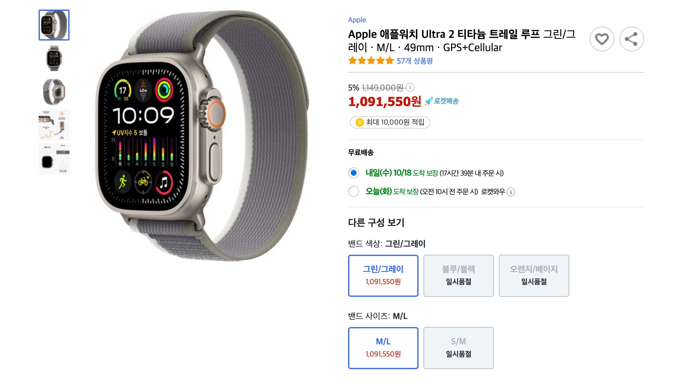 애플워치 울트라2를 사려면 알파인루프, 트레이루프, 오션밴드 3가지로 나눠져있는걸 보실 수 있습니다.