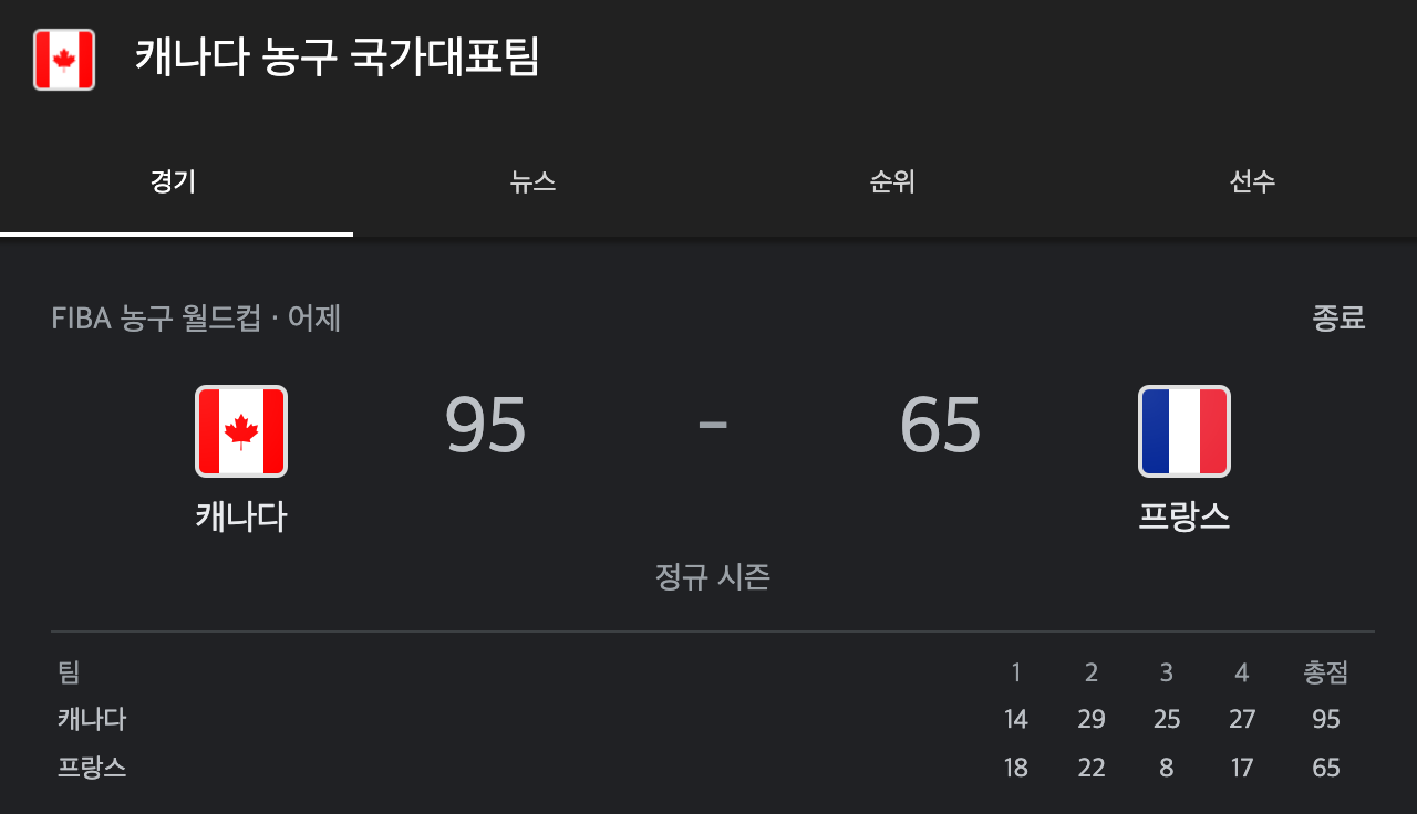 세르비아가 돈치치 원맨팀이라면, 캐나다는 탄탄한 팀워크와 스쿼드를 자랑하는 팀입니다. 이미 강호 프랑스를 셧아웃 시켰는데요. 앞으로의 모습도 기대가 되네요.